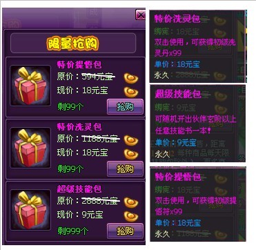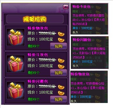 活动期间仅三天,伙伴、锻造、异火界面增加超值限量礼包【特价物攻包,特价斗攻包,特价闪避包,特价体悟包,特价洗灵包,超级技能包,特价强化包,特价打孔包,特价镶嵌包】,活动期间每天限量出售,不要错过机会喔!