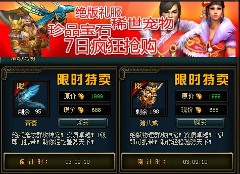 【活动内容】:新区开服后活动时间内,将会对部分橙色宠物、特殊时装、重要道具进行限量打折出售,轻松获得极品宝宝,还在等什么,机会不容错过!